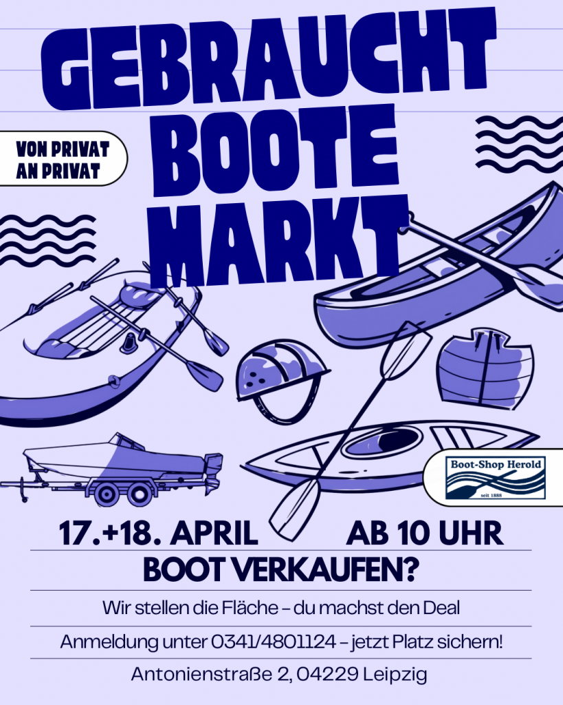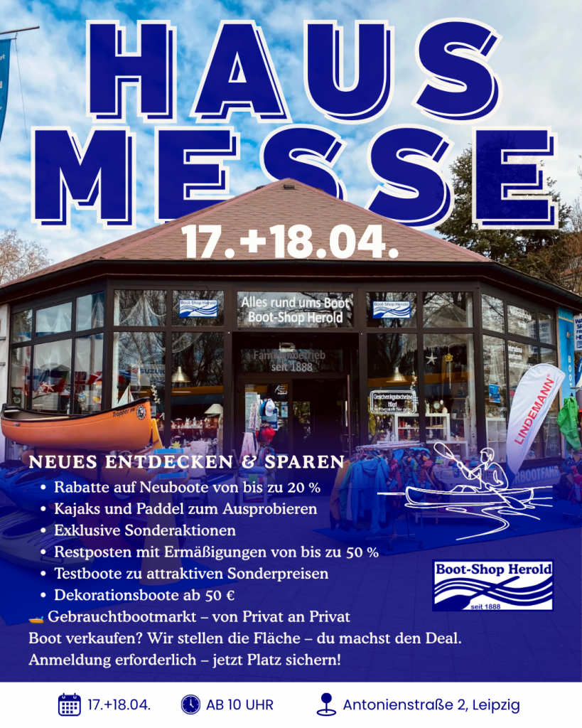Besuchen Sie uns am 17. und 18. April 2026 ab 10 Uhr in Leipzig, Boot-Shop Herold und entdecken Sie alles rund um Kajaks und Kanus. Nutzen Sie die Gelegenheit, unsere Sonderangebote und Rabatte. Tauchen Sie ein in die Welt des Wassersports. Egal, ob Sie erfahrene Paddler sind, gerade erst anfangen, Motorbootfahrer oder Segler sind die Hausmesse bietet für jeden etwas. Nutzen Sie die Gelegenheit, verschiedene Kajaks und Paddel auszuprobieren und sich über Außenborder von Experten beraten zu lassen. Finden Sie das perfekte Boot oder den perfekten Motor für Ihre Abenteuer. Wir freuen uns darauf, Sie im Boot-Shop Herold in Leipzig willkommen zu heißen und gemeinsam die Freude am Wassersport zu teilen!